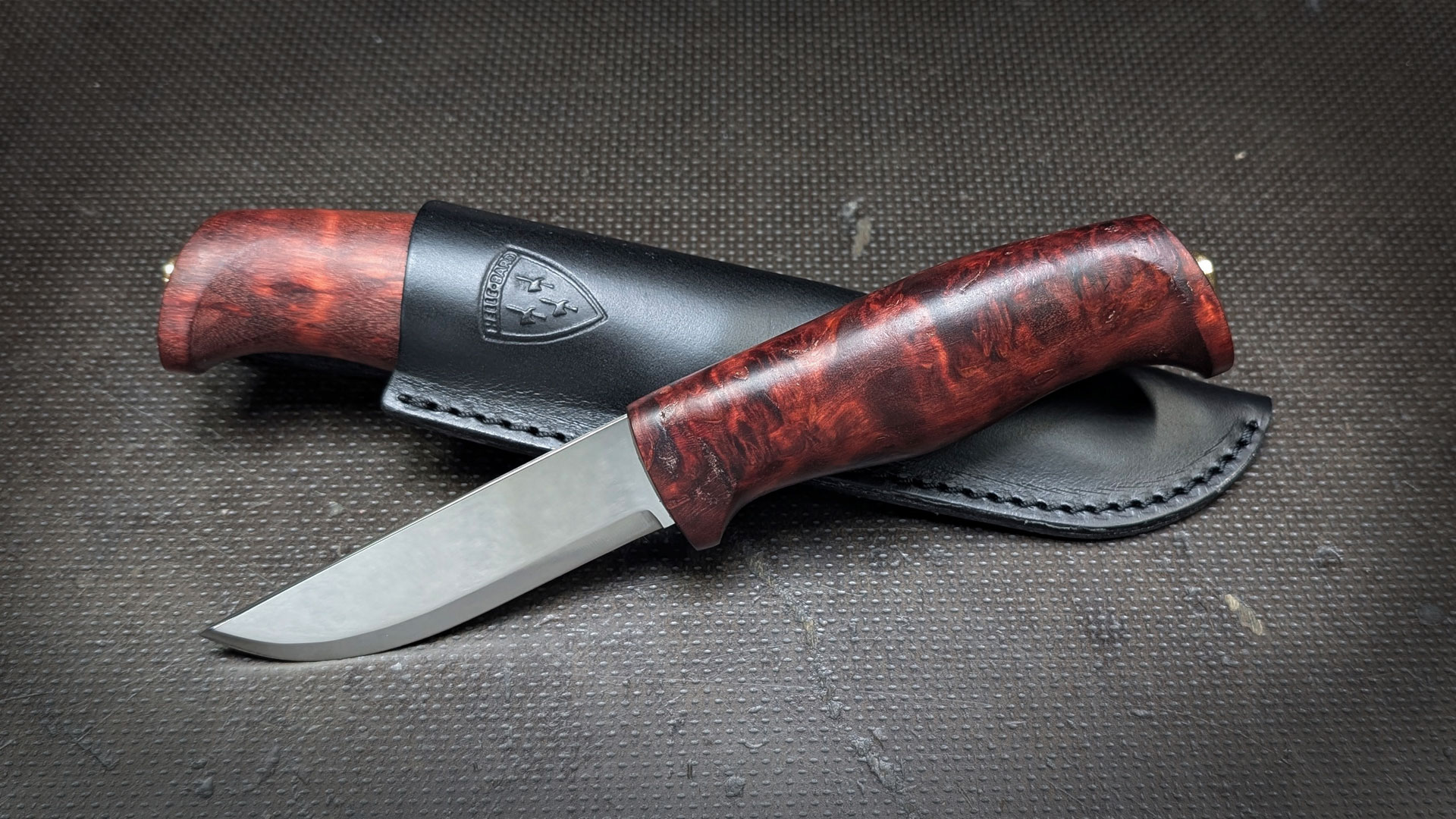 Der Griff aus dunkelbrauner Maserbirke liegt warm und ausgewogen in der Hand und überzeugt durch seine natürliche Eleganz sowie hervorragende Ergonomie. Jede Griffstruktur ist einzigartig und unterstreicht den hochwertigen, handwerklichen Charakter dieses Messers.