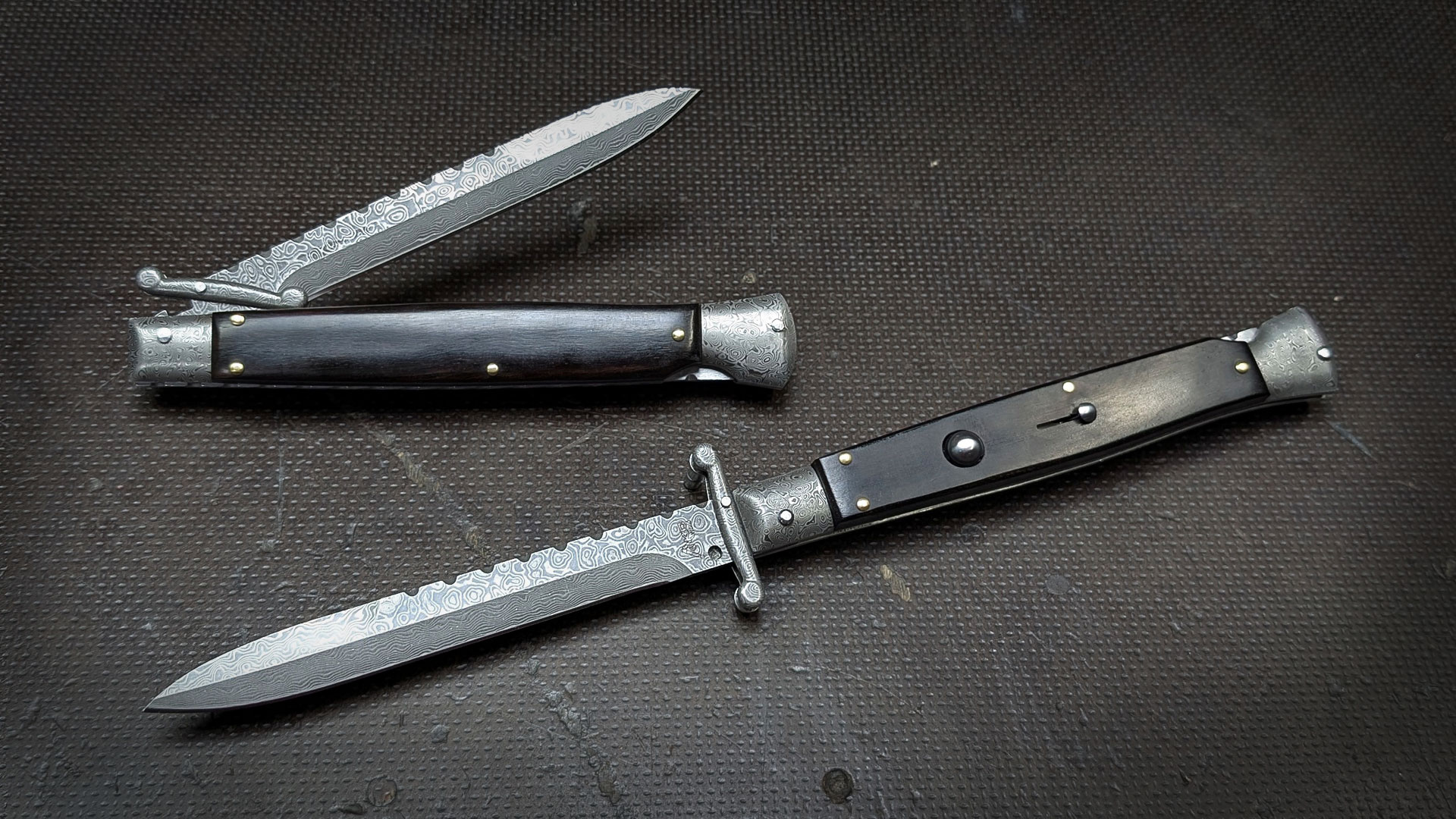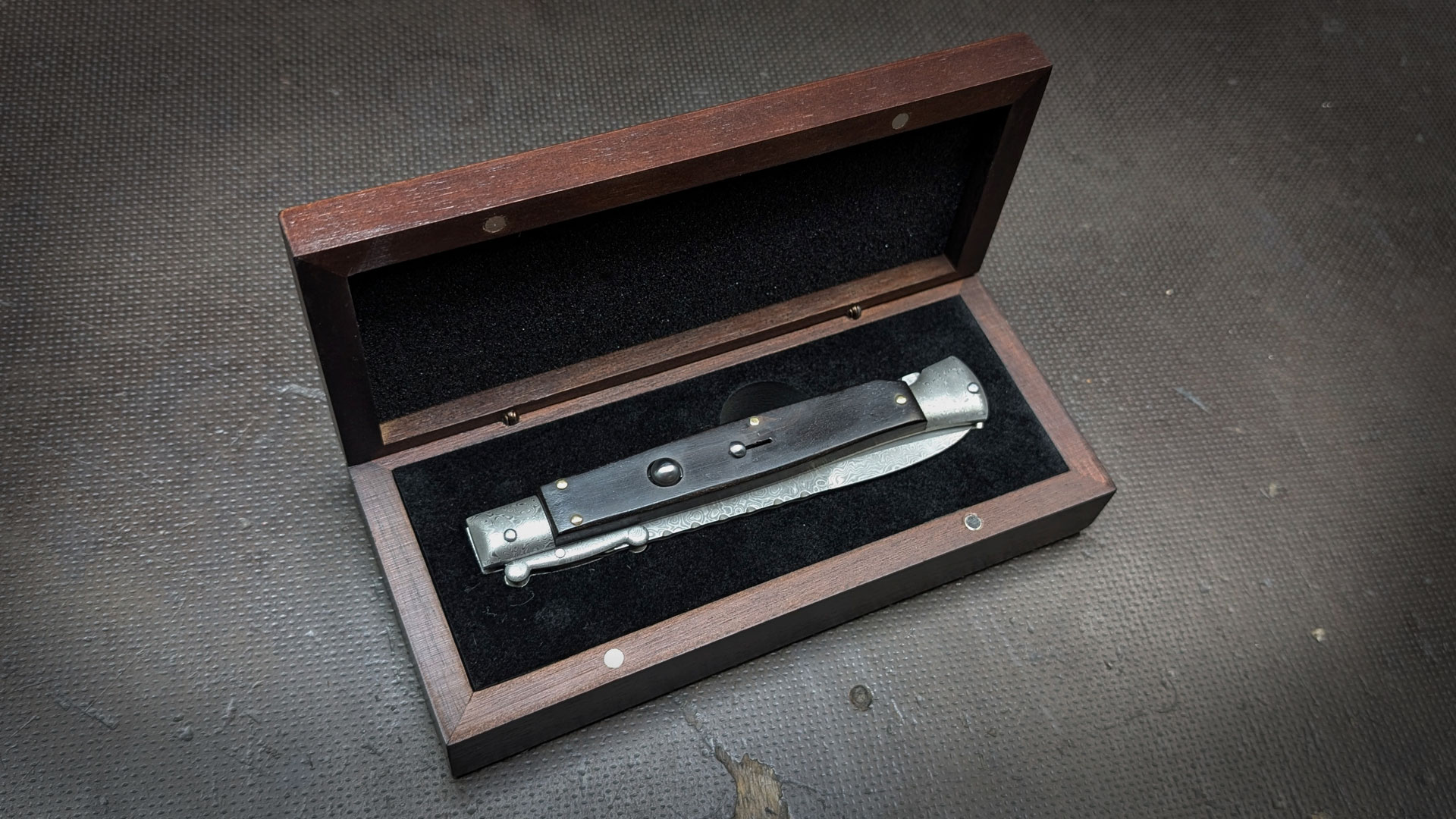 Der Griff ist aus Ebenholz gefertigt, während die Klinge und die Liner aus Damaszenerstahl bestehen.