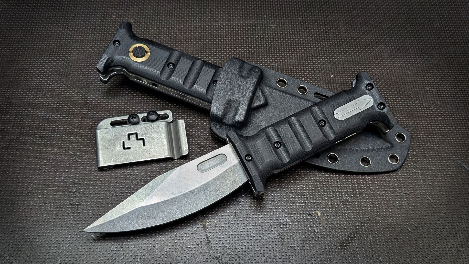 Das Extension Knife verfügt über eine massive und wuchtige D2-Klinge, die sowohl im geöffneten als auch im geschlossenen Zustand mit einem groß dimensionierten Querbolzen verriegelt. Der Querbolzen kann zusätzlich für eine nochmals höhere Belastbarkeit sowohl im voll geöffneten als auch im eingekürzten Zustand ohne Werkzeug in den Griff geschraubt werden. Das Messer muss so auch zum Öffnen zwangsweise mit zwei Händen bedient werden, ist also ein Zweihandmesser reinsten Wassers. Der Griff aus zwei dicken Stahlplatinen und gefrästem G10 ist eine moderne Anlehnung an die Doppel-T-Griffe der Baselards des 14. und 15. Jahrhunderts. Für einen vielseitigen Einsatz verfügt das Messer über einen soliden Schlagdorn am Griffende.