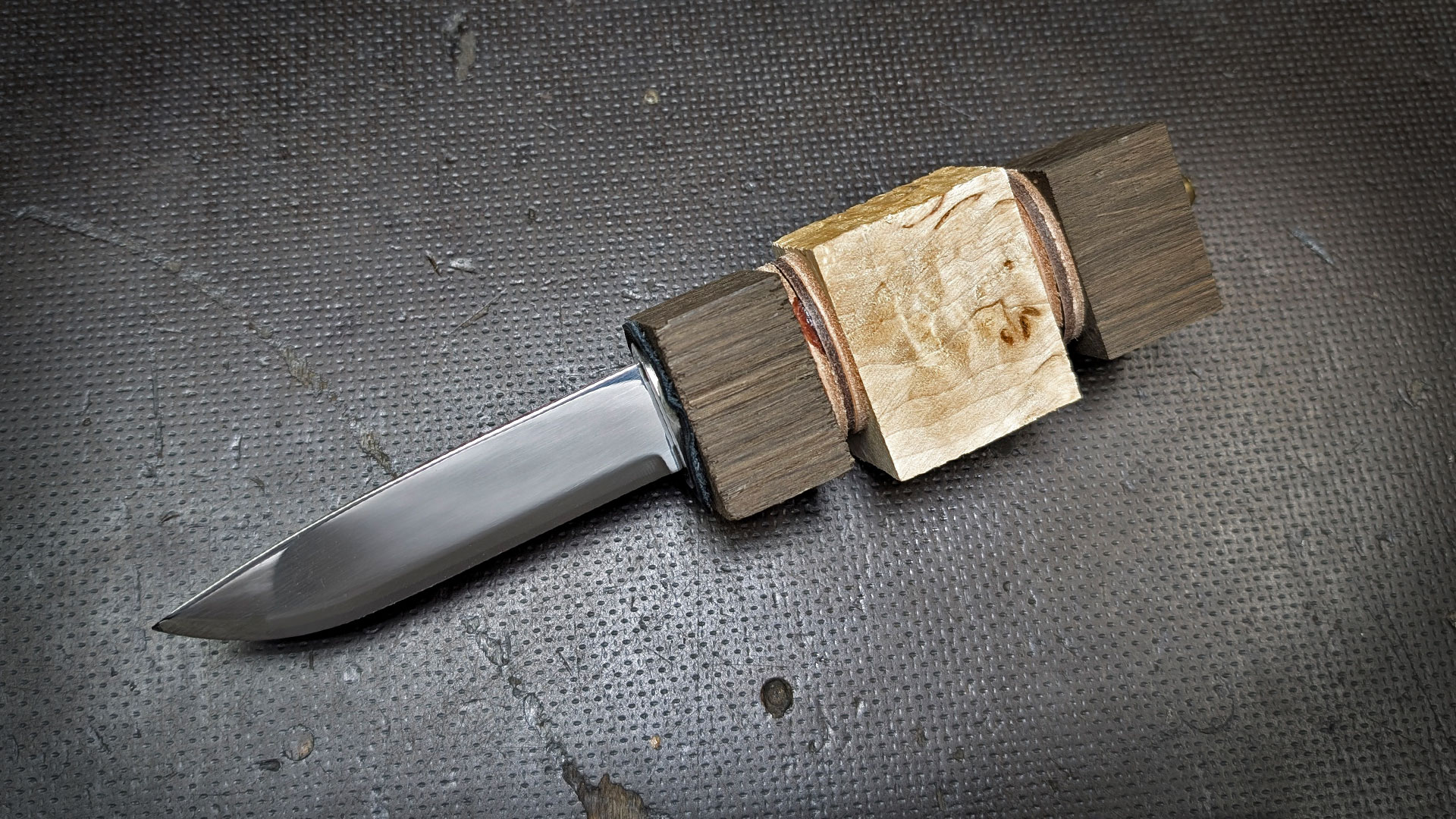 Klingenmaterial: Dreilagenstahl rostfrei - 59HRC Griffmaterial: Eiche - Maserbirke
