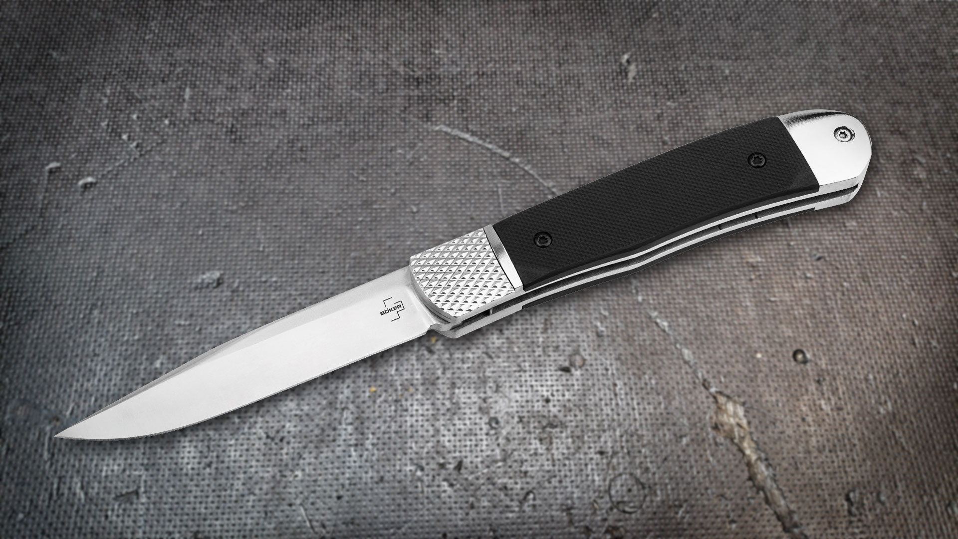 Das Vermächtnis eines Klassikers; zeitlos traditionell – traditionell zeitlos und zeitgemäß interpretiert von Böker Plus. Das Ur-Trapper verdankt seinen Namen den Fallenstellern, welche die Wälder Nordamerikas für die Jagd durchstreiften. Die Bauform des Messers reicht bis ins 19. Jahrhundert zurück und ist gekennzeichnet durch eine schlanke Linienführung und die charakteristischen Ober- und Unterbacken am Griff. Statt Nagelhau und Slipjoint verwendet das Böker Plus Hidden Release Trapper als Automatikmesser mattierte Vorderbacken aus Edelstahl, von denen die linke über den diskret untergebrachten Bolster Lock (US Design Patent von CobraTec) die satinierte D2 Klinge durch einfaches Hochschieben öffnet und wieder entriegelt. Aufgegriffen wird das industriell anmutende Design der Vorderbacken durch die feine, rutschfeste Textur der handschmeichelnden Griffschalen aus schwarzem G10.