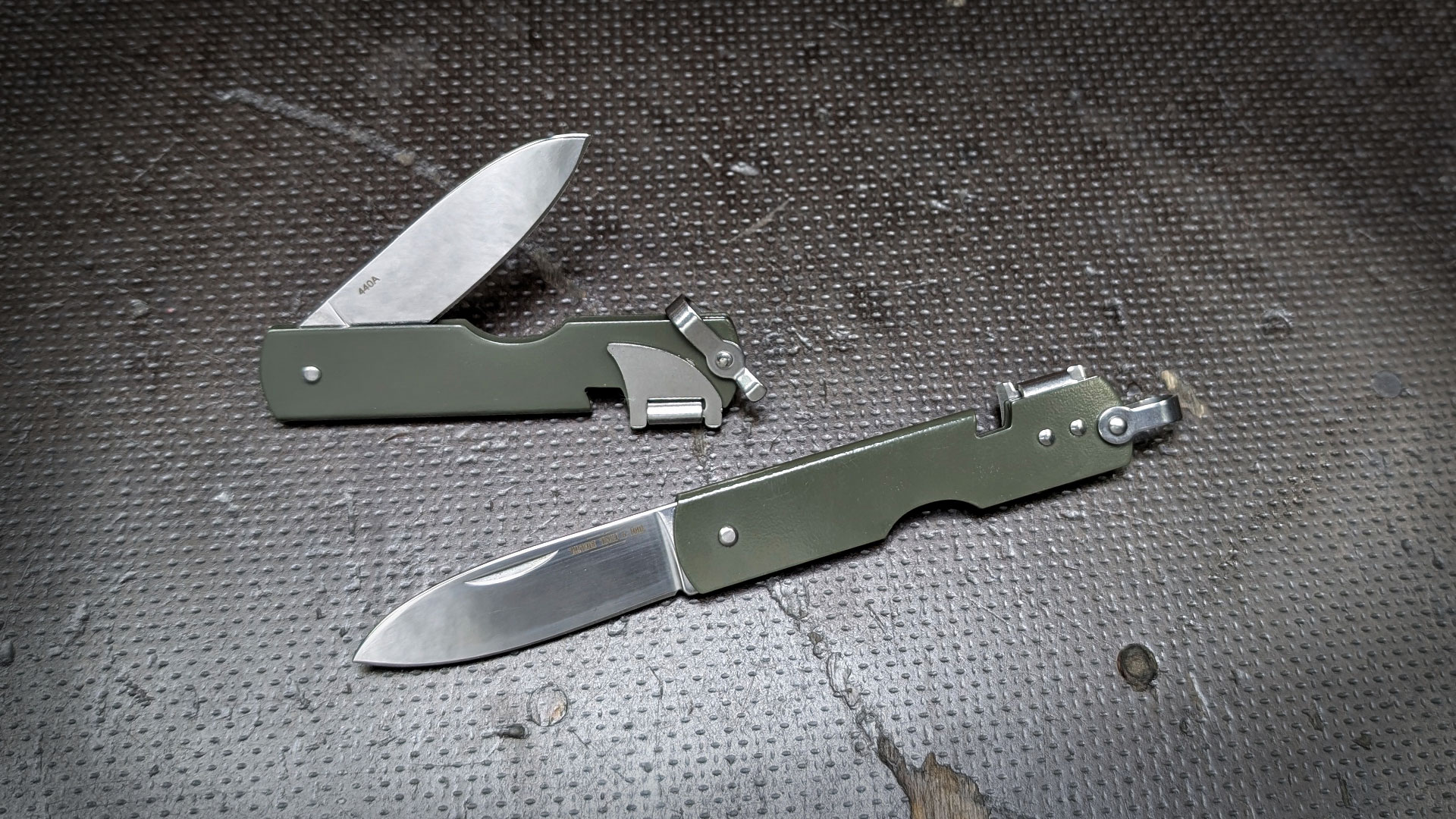 Die einfache Konstruktion aus gebogenem Edelstahlblech ermöglicht dabei so geringe Herstellungskosten, dass man sich leisten kann an mehreren Orten ein Backup-Messer zu deponieren. Der besondere Clou ist ein integrierter Dosenöffner nach Vorbild des legendären US Army Pocket Can Opener P-38. Dieser ist mit zwei massiven Nieten am Griff befestigt und kann mit dem Fangriemenbügel gegen unbeabsichtigtes Öffnen arretiert werden. Die mittelspitze Klinge aus rostfreiem 440er-Edelstahl verfügt über einen Nagelhau als Öffnungshilfe. Der Griff ist nach historischem Vorbild im authentischen Farbton Oliv Drab lackiert.