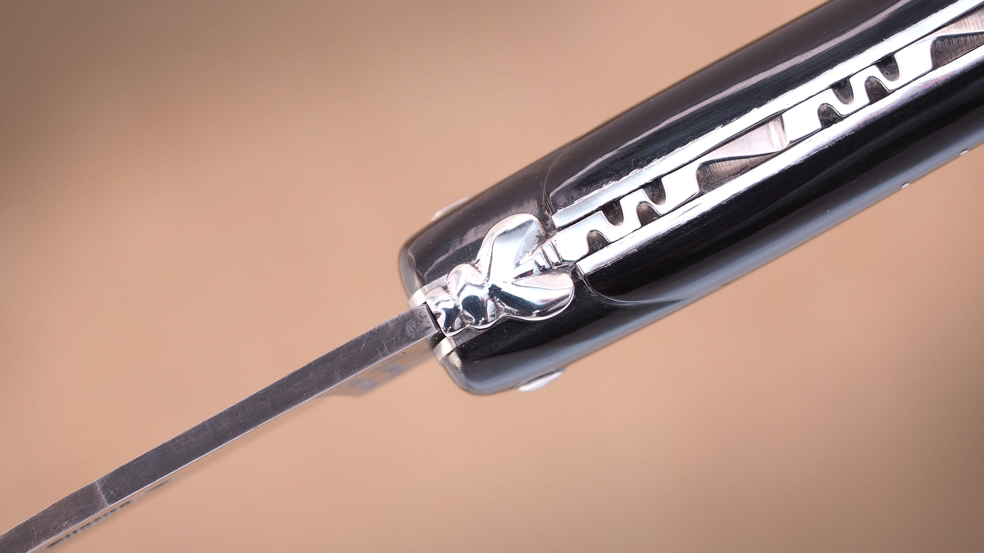 Der volle Griff wurde aus poliertem Büffelhorn angefertigt. Die 14 cm lange Klinge aus XC75 Carbonstahl (nicht rostfrei) ist brüniert und passt hervorragend zum Glanz des polierten Griffs.