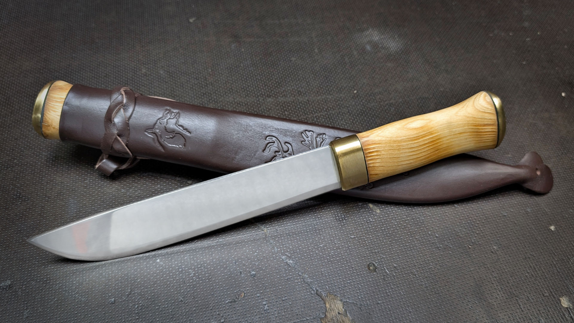 Die Sámi nutzen diese großen Messer (Lauku) in ihrem mobilen Alltag. Dieses große Messer verfügt über eine nicht laminierte Klinge aus 12C27-Edelstahl. Die Klinge ist relativ dünn, um ein effektives Schneiden zu ermöglichen. Der tonnenförmige Griff ist aus Birkenholz mit Messingbeschlägen gefertigt. Geeignet für mittlere bis große Hände.