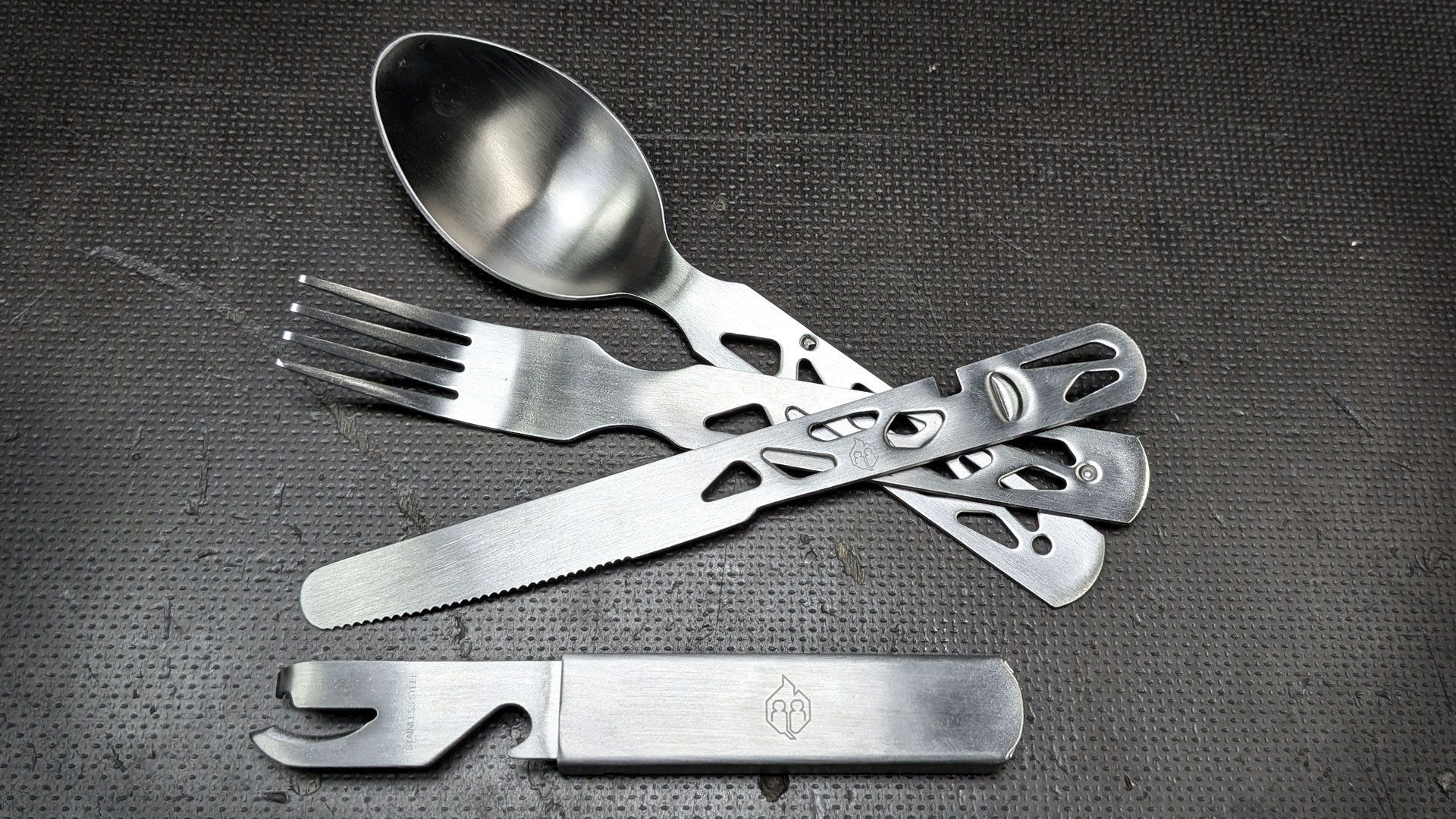 • Vielseitiges Camping-Besteck: Messer, Gabel, Löffel sowie Kapselheber und Dosenöffner in einem praktischen Set.