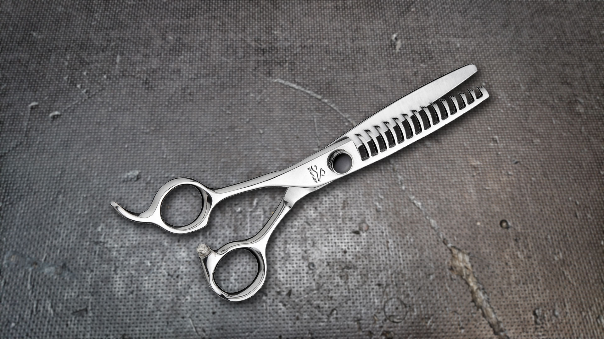 Modellierschere geeignet für Schiebe-Schnitte dank der Position und gekrümmten Zahnen.