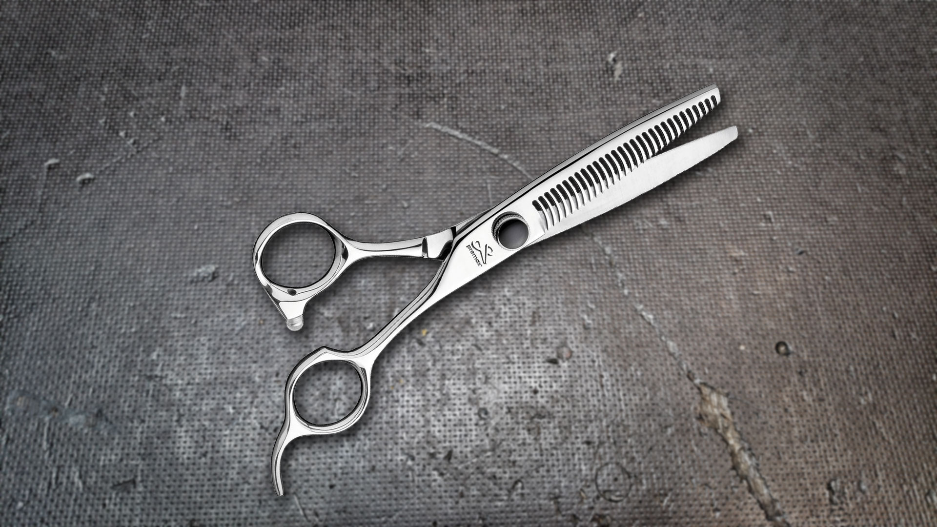 Modellierschere geeignet für Schiebe-Schnitte dank der Position und gekrümmten Zahnen.