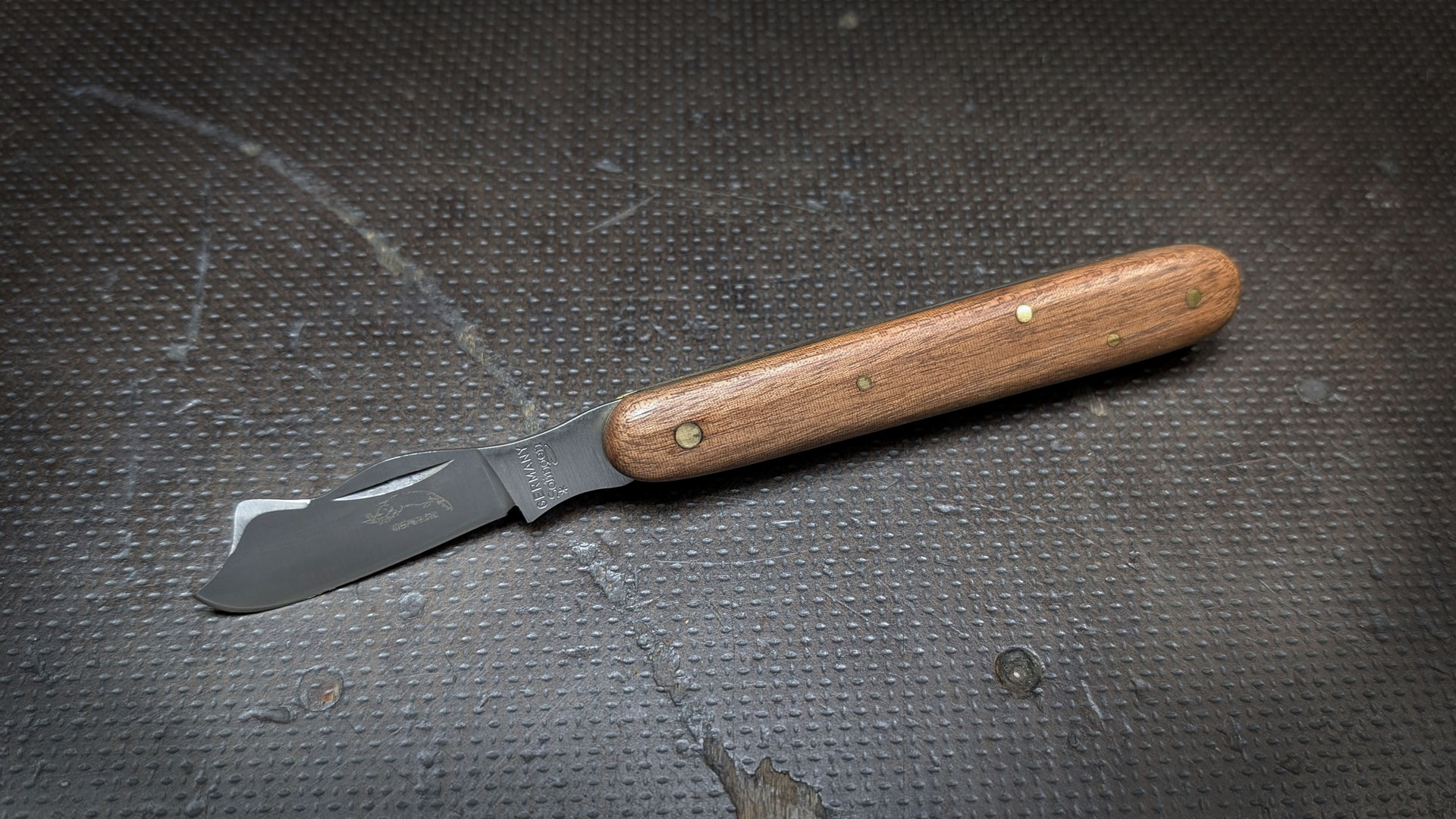 Dieses Veredelungsmesser ist ein Universalmesser für Baumschulen und Gärtner. Durch den schmalen Griff wird eine exakte Klingenführung unterstützt. Die Klinge ist einseitig schräg geschliffen, während die Rückseite einen geraden Schliff besitzt. Auf 60 HRC gehärtet und fein abgezogen hält die Schneide lange ihre Schärfe. Die Griffschalen sind aus robustem Sapeli gefertigt.